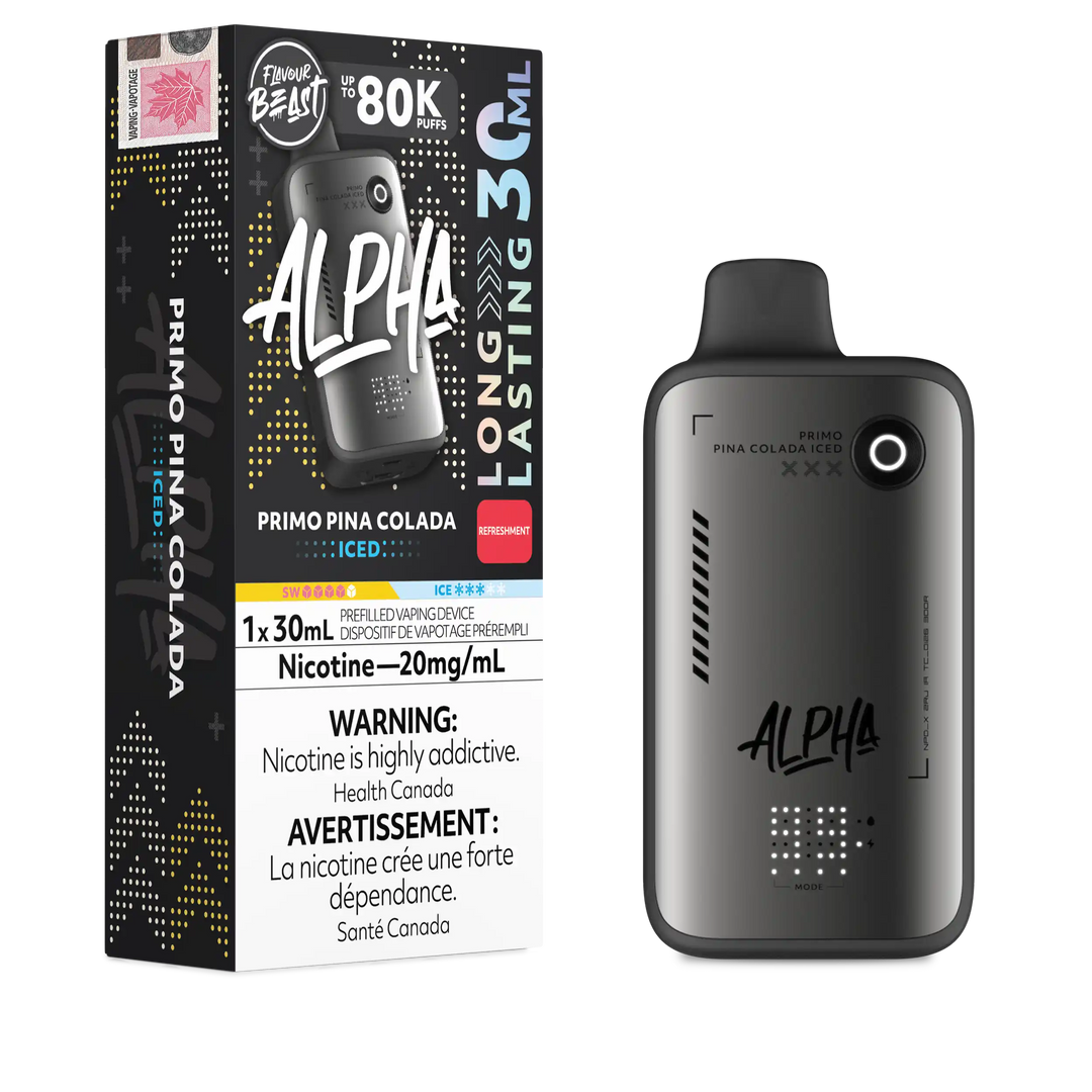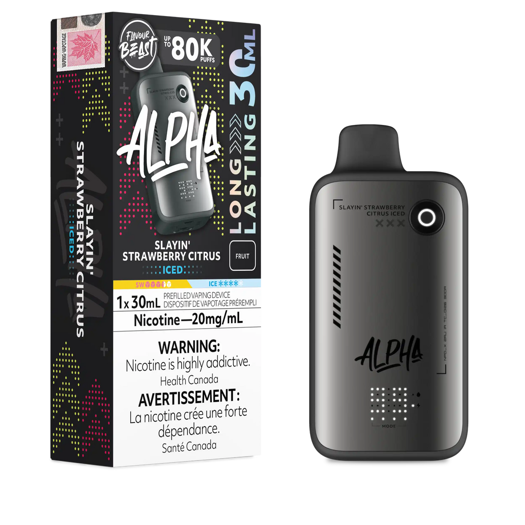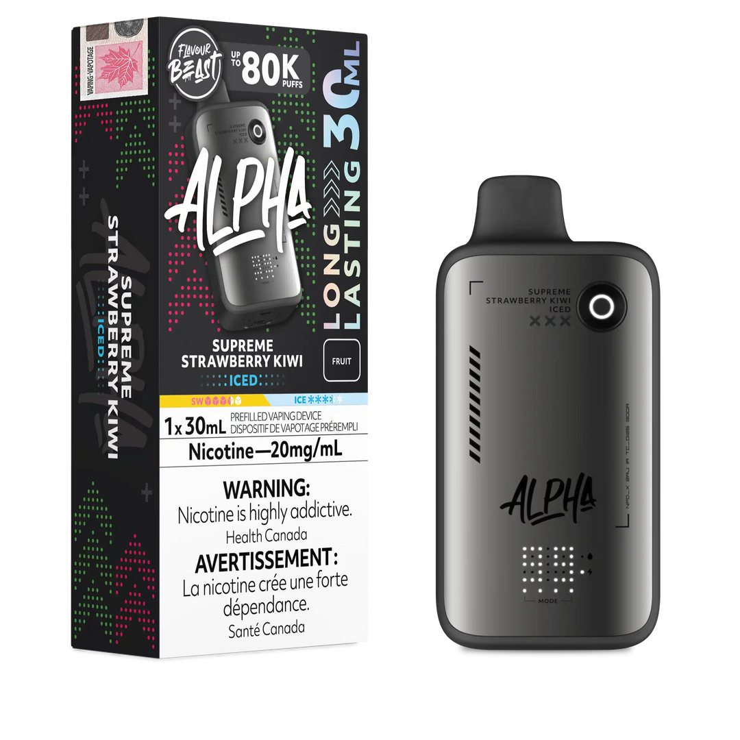 The Flavour Beast Alpha flavour lineup includes many of the brand’s most popular blends, such as Bomb Blue Razz, Trippin’ Triple Berry, Jumpin’ Juicy Peach, Cherry Blast Iced, Cool Cucumber Lime Iced, Supreme Strawberry Kiwi Iced, Wavin’ Watermelon Lime Iced, Extreme Mint Iced, Atomic Apple Iced, and more, focusing on bold fruit and iced profiles with the signature Flavour Beast sweetness and punch. With 30 mL capacity, dual mesh coils, up to 80K puffs, USB‑C charging, screen + airflow + power control, Flavour Beast Alpha sits at the top of the Flavour Beast disposable range for users who want a feature‑rich, ultra‑long‑lasting disposable instead of a basic stick.